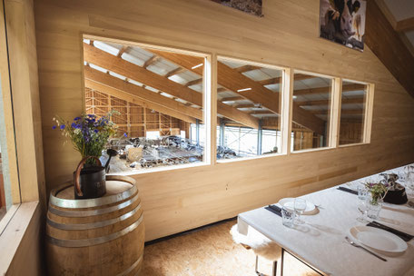 Beim neuen Stall bieten wir einen Eventraum an: Der ist ziemlich kuhl, nicht nur weil man vom Obergeschoss zu den Kühen hinunterschauen kann.